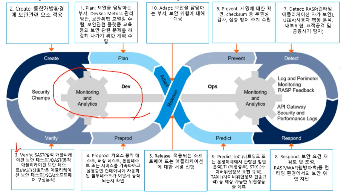 📚DevSecOps(Development + Security + Operations): DevOps에 보안(Security)을 통합한 개념, SW개발보안 프로세스와 유사한 보안활동을 수행 개발 단계(Dev) 운영 단게(Ops)로 나뉨