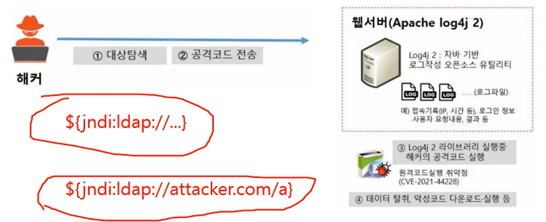 - Java 기반 로깅 도구인 Apache Log4j 라이브러리 원격 코드 실행 취약점