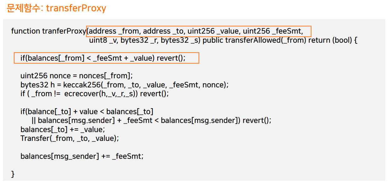 연산에서 오버플로우가 발생하면 매우 작은 값이 되어 잔액 검증을 우회할 수 있게 된다. 그래서 _feeSmt를 매우 크게 설정하게 되면 우회할 수 있다.