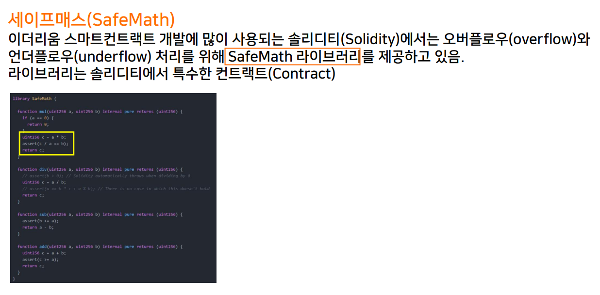 Solidity에서 오버플로우 처리를 위한 SafeMath 라이브러리를 제공하는데, 이를 사용하지 않았음. 그냥 사칙연산만 수행하여 발생한 일이다.
