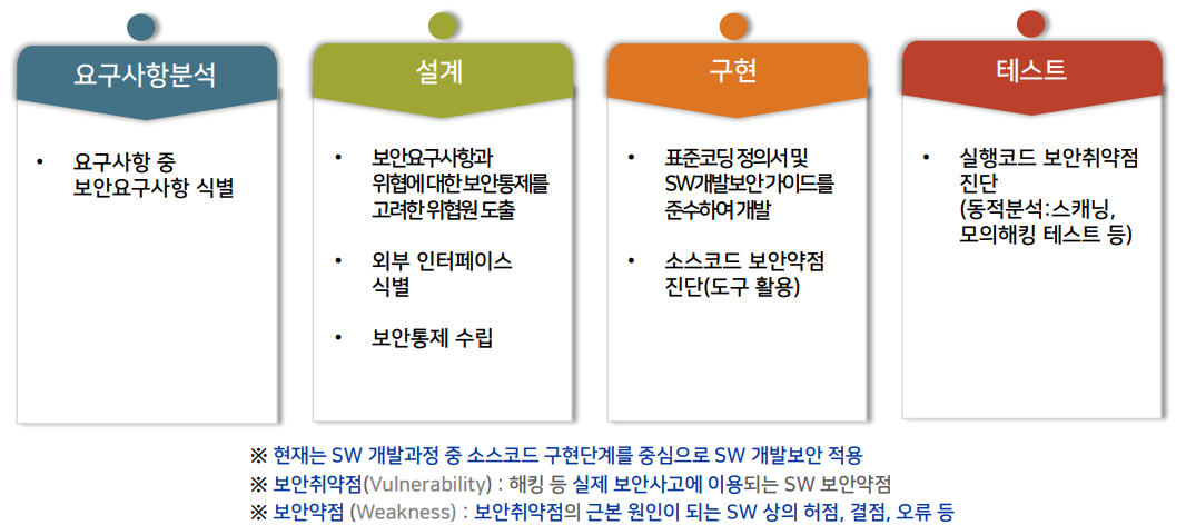 - ‘SW개발보안 프로세스 + DevSecOps’: 애플리케이션 수명주기 따른 반복+지속적 보안 제어 필수