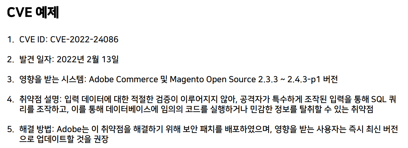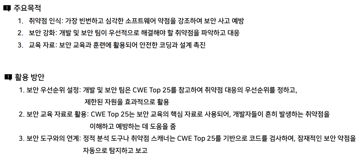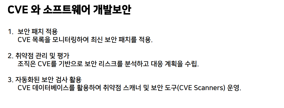 - 특히 SW개발자는 CVE데이터를 활용하여 보안 취약점을 사전에 예방하고 신속하게 패치 적용