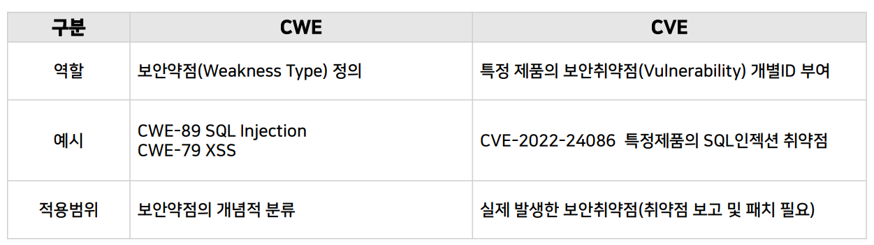 📚CWE(Common Weakness Enumeration): 미 국토 안보부(The U.S. Department of Homeland Security)에서 관리하고 있으며, 소프트웨어와 하드웨어의 보안약점을 체계적으로 정리한 공개 목록