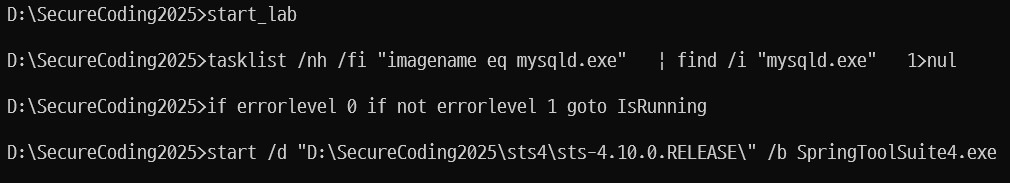 - cmd 창에서 D:\SecureCoding2025로 이동하여 준비되어 있는 시작 배치 파일 실행