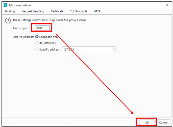 - Edit proxy listener 창에서 ‘Bind to port’ 항목을