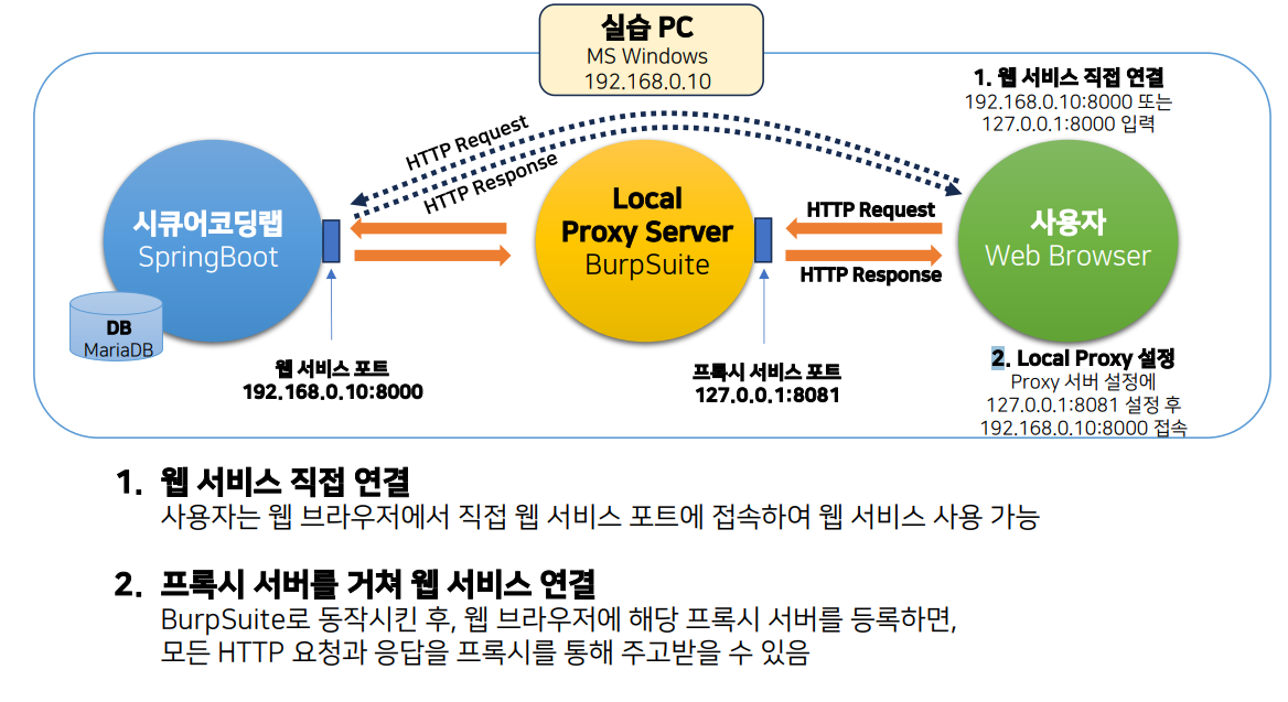 - 웹 서비스 직접 연결이 아니라 프록시 서버를 거쳐 연결하면 간편하게 통신 내용 조작을 통한 취약점 공격, 중요 정보를 가로챌 수 있음.