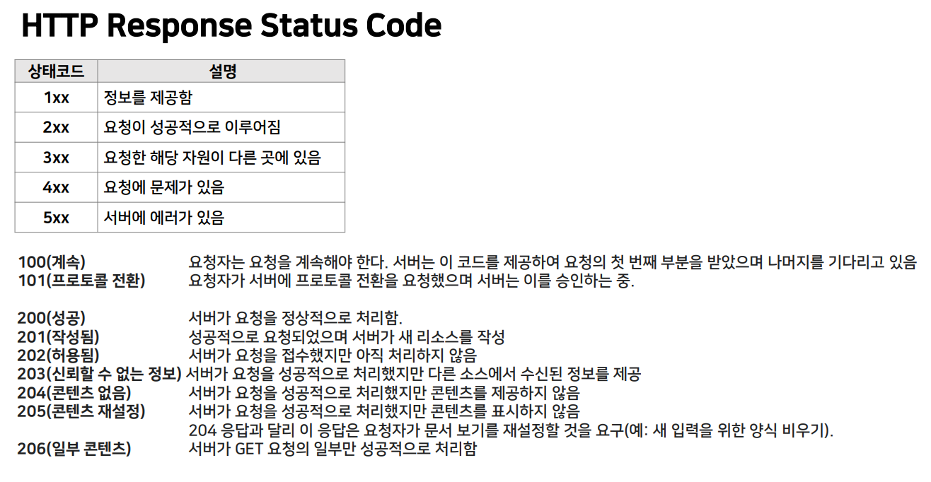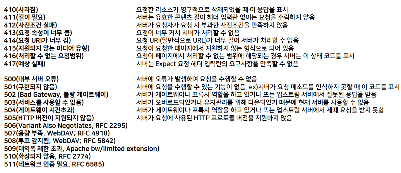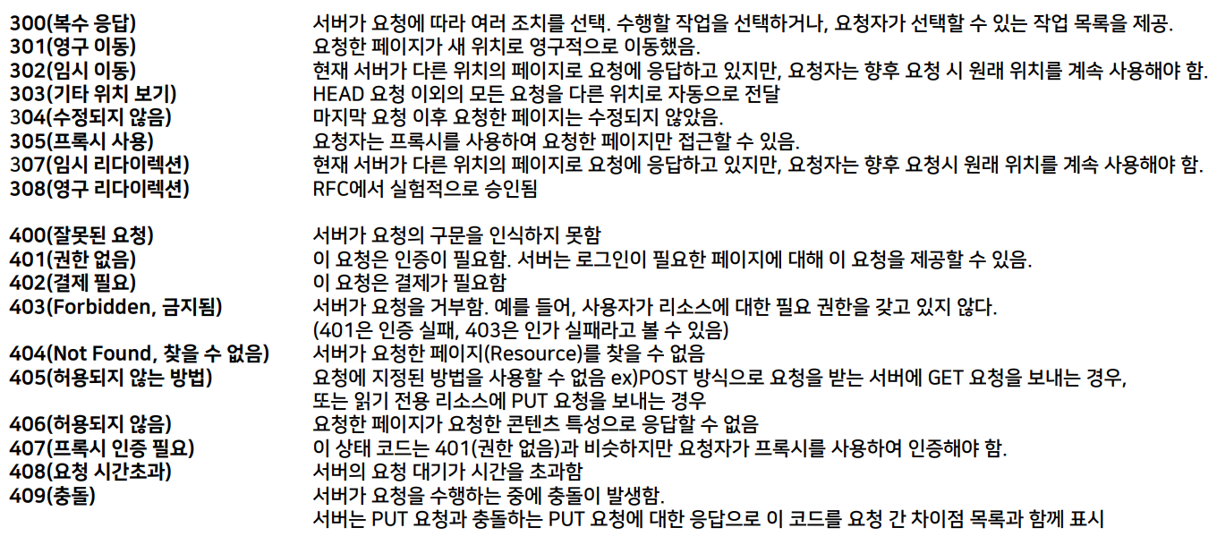 - 무상태(Stateless): 서버는 이전 요청을 기억하지 않음 (쿠키/세션으로 해결)
