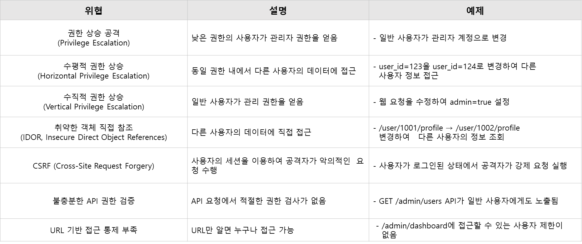 - 요청에 포함된 토큰/세션 정보 기반으로 접근 권한을 갖고 있는지 확인
