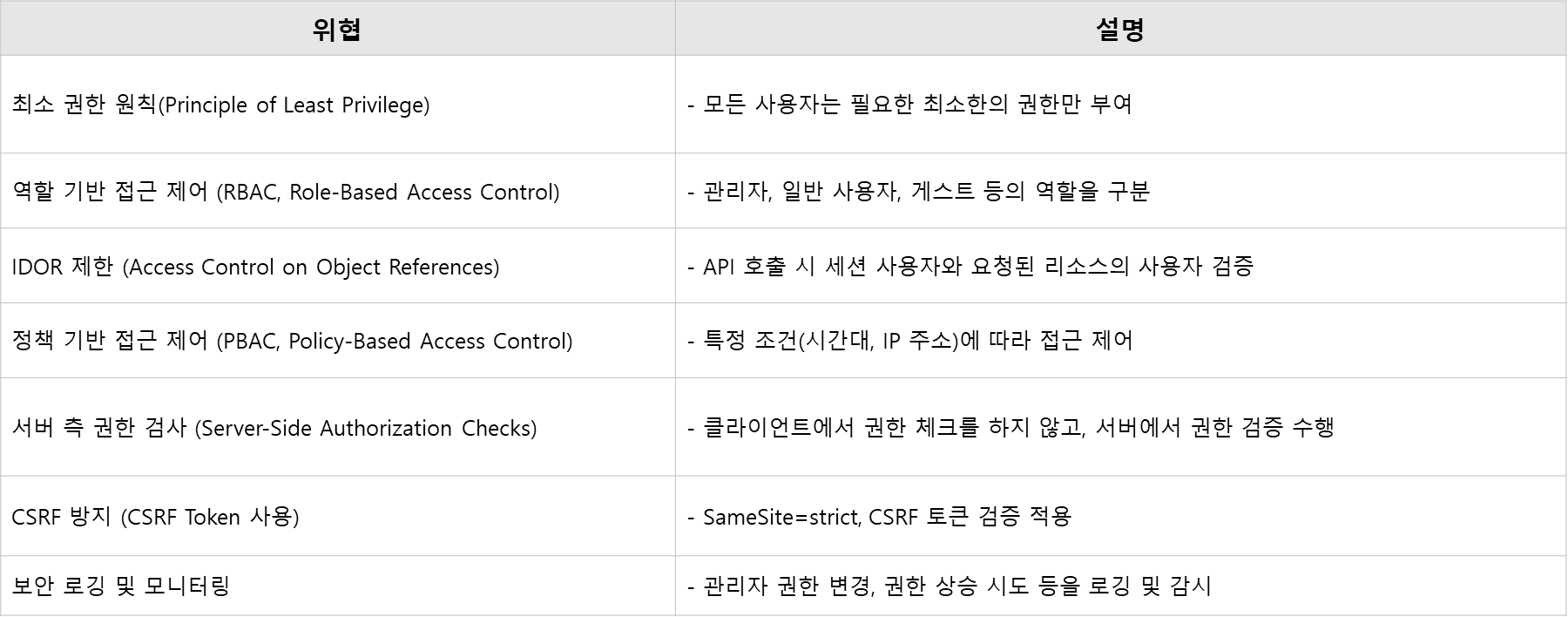 - 역할기반 접근제어(RBAC): 사용자에게 ‘관리자’, ‘일반 사용자’ 같은 역할을 부여해 권한을 설정