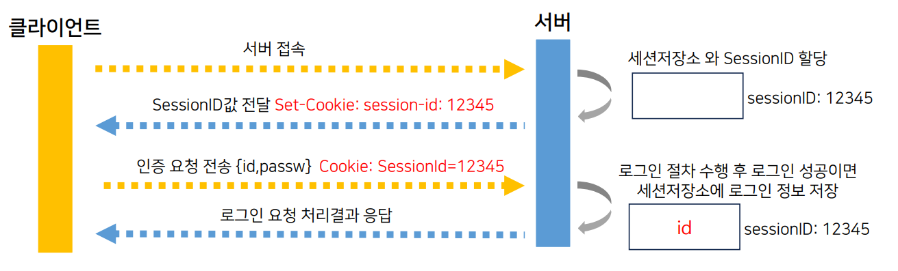 - 사용자가 웹사이트에 접속하게 되면 세션저장소가 할당, 할당된 저장소를 식별하기 위해