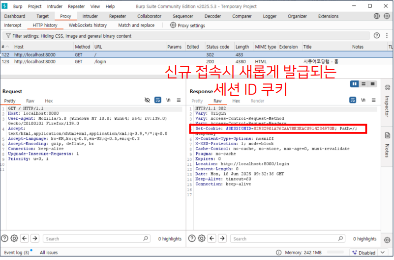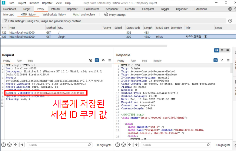 - 하단에 HTTP Response 내용 확인 - Set-Cookie 헤더에, 새로운 세션 ID 값 확인