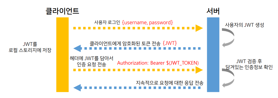 사용자가 로그인 시도 → 서버가 JWT 발급 → 클라이언트가 JWT 저장 → 요청마다 JWT를 포함하여 전송 → 서버에서 검증 후 응답
