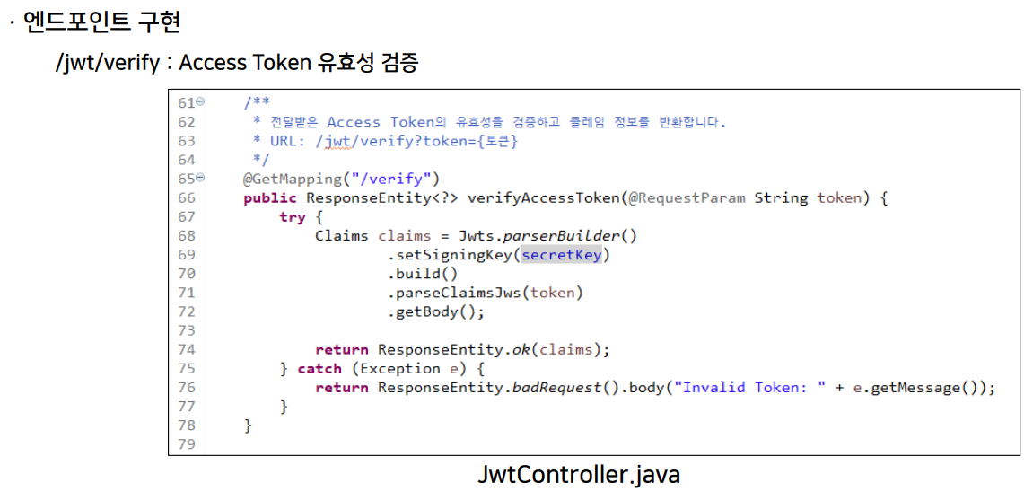 - μλ²λ JWTμ μλͺ , λ§λ£μκ°, λ°κΈμ λ±μ κ²μ¦νμ¬ ν ν°μ λ¬΄κ²°μ± νμΈ