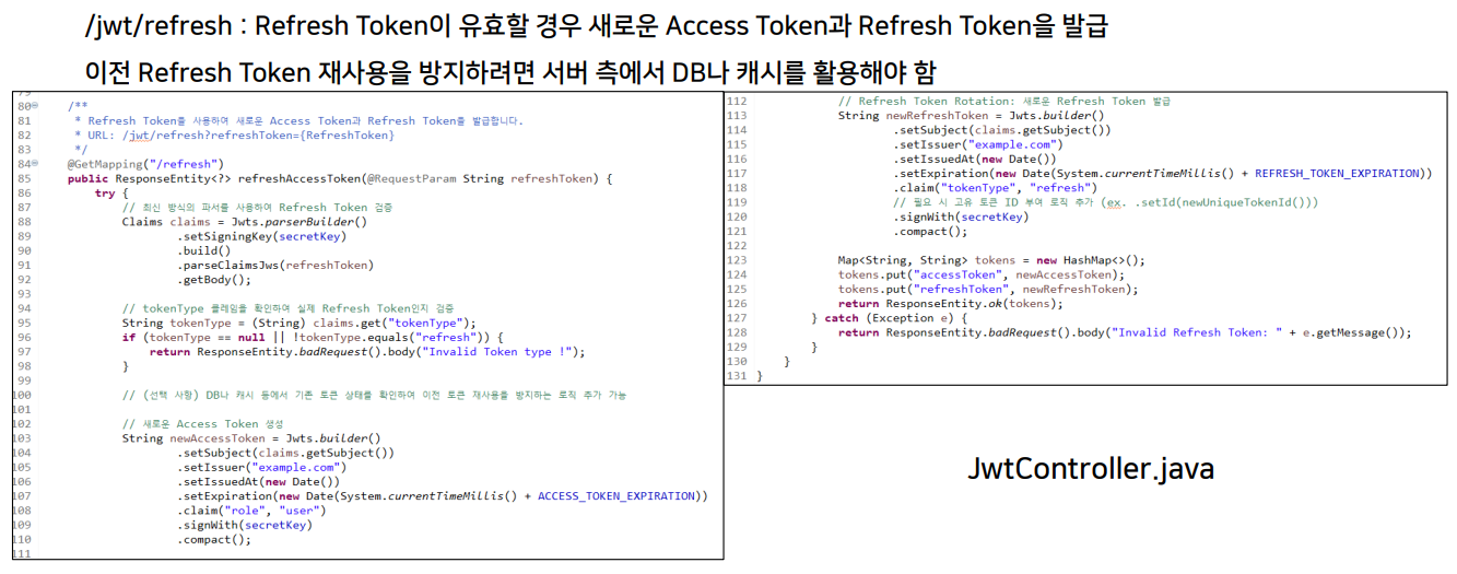 - Refresh Tokenκ³Ό ν ν° νμ μ λ΅μ ν΅ν΄, μ€λλ κΆν μ 보λ₯Ό κ°μ§ ν ν° μ¬μ© λ°©μ§
