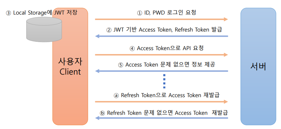 - ν΄λΌμ΄μΈνΈλ μΈμ¦ ν JWTλ₯Ό λ°κΈλ°μ, μ΄ν μμ² μ HTTP ν€λμ ν¬ν¨ (