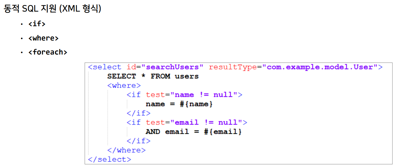 - ๋์ ์ฟผ๋ฆฌ ์์ฑ ์ - ORM์ด ์ ๊ณตํ๋ ๋์ SQL ํ๊ทธ(์: MyBatis์
