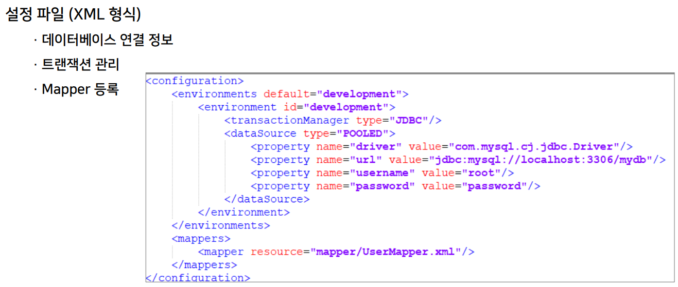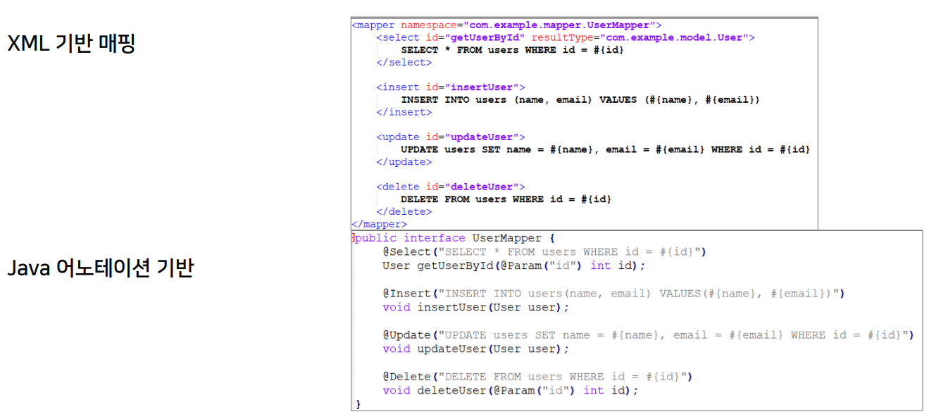 - SQL ๋ฌธ๊ณผ ๋งคํ ์ ๋ณด๋ฅผ ๋ด์ XML ํ์ผ ๋๋ ์ด๋ ธํ ์ด์ ์ฌ์ฉ