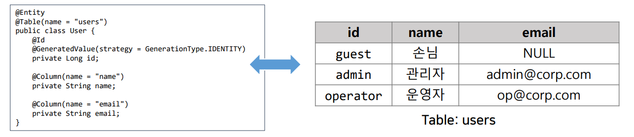 - ํด๋์ค์ ํ ์ด๋ธ, ํ๋์ ์ปฌ๋ผ์ ์๋ ๋งคํ โ SQL ์์ฑ ์์ด ๋ฐ์ดํฐ ์กฐ์