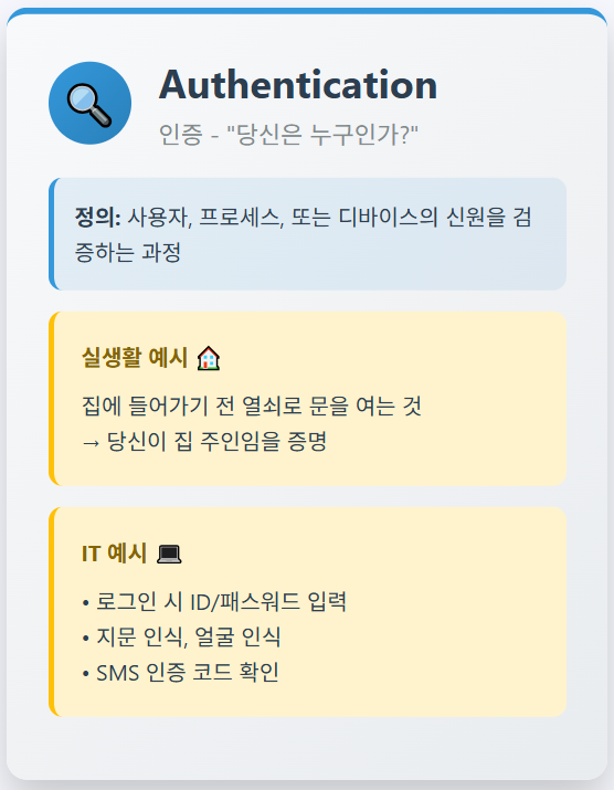 ๐Authentication (์ธ์ฆ): ์ฌ์ฉ์, ํ๋ก์ธ์ค, ๋๋ ๋๋ฐ์ด์ค์ ์ ์์ ๊ฒ์ฆํ๋ ๊ณผ์