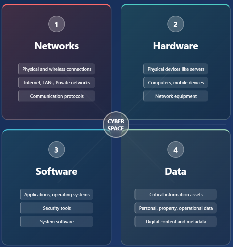 - ์ฌ๊ธฐ์ ์ฌ์ด๋ฒ๋ณด์์ด ๋ณดํธํ๋ ๋ฒ์๋ฅผ Cyberspace๋ผ๊ณ ํ๋ค. Cyberspace์ ๊ตฌ์ฑ์์: