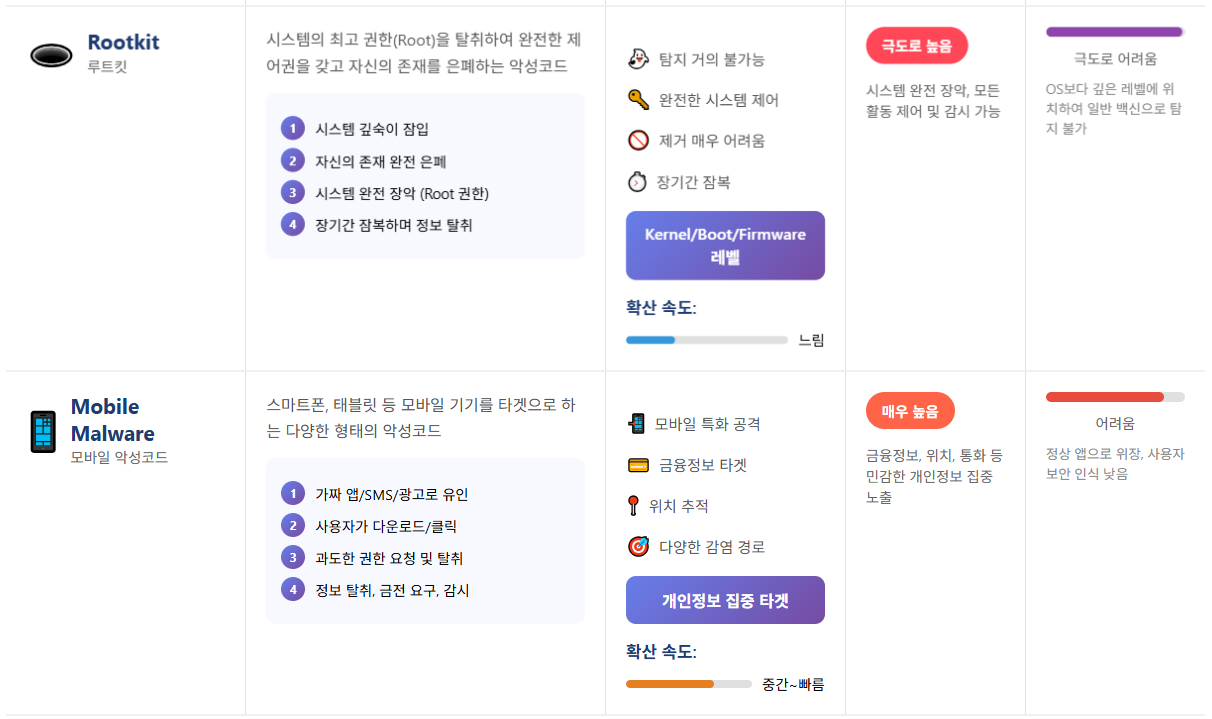 πRootkits: μμ€ν μ κ°μ₯ κΉμ κ³³(Root Level)μ μ¨μ΄μ μ μμ μΈ κ³΅κ²©μμκ² μμ ν μ μ΄κΆμ μ£Όλ μ μ±μ½λ