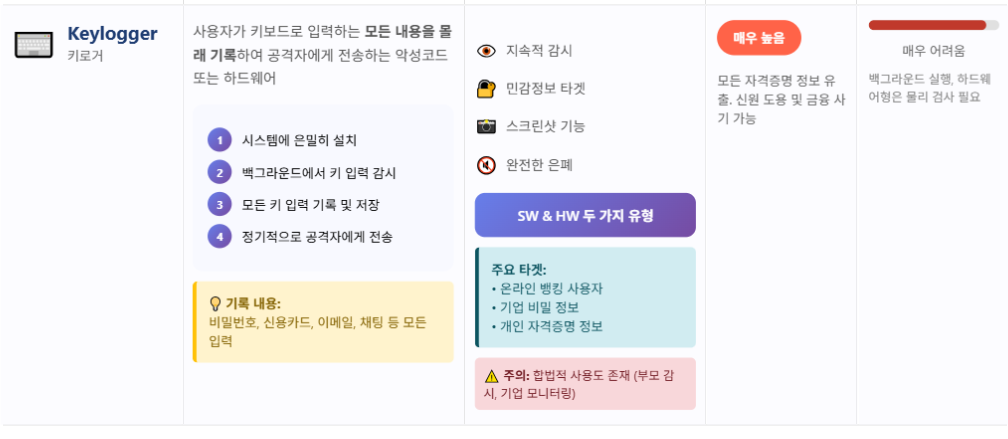 πKeylogger : μ¬μ©μκ° ν€λ³΄λλ‘ μ λ ₯νλ λͺ¨λ λ΄μ©μ λͺ°λ κΈ°λ‘νμ¬ κ³΅κ²©μμκ² μ μ‘νλ μ μ±μ½λ λλ νλμ¨μ΄