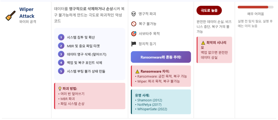 πWiper Attack (μμ΄νΌ 곡격): λ°μ΄ν°λ₯Ό μꡬμ μΌλ‘ μμ νκ±°λ μμμμΌ λ³΅κ΅¬ λΆκ°λ₯νκ² λ§λλ κ·Ήλλ‘ νκ΄΄μ μΈ μ μ±μ½λ 곡격